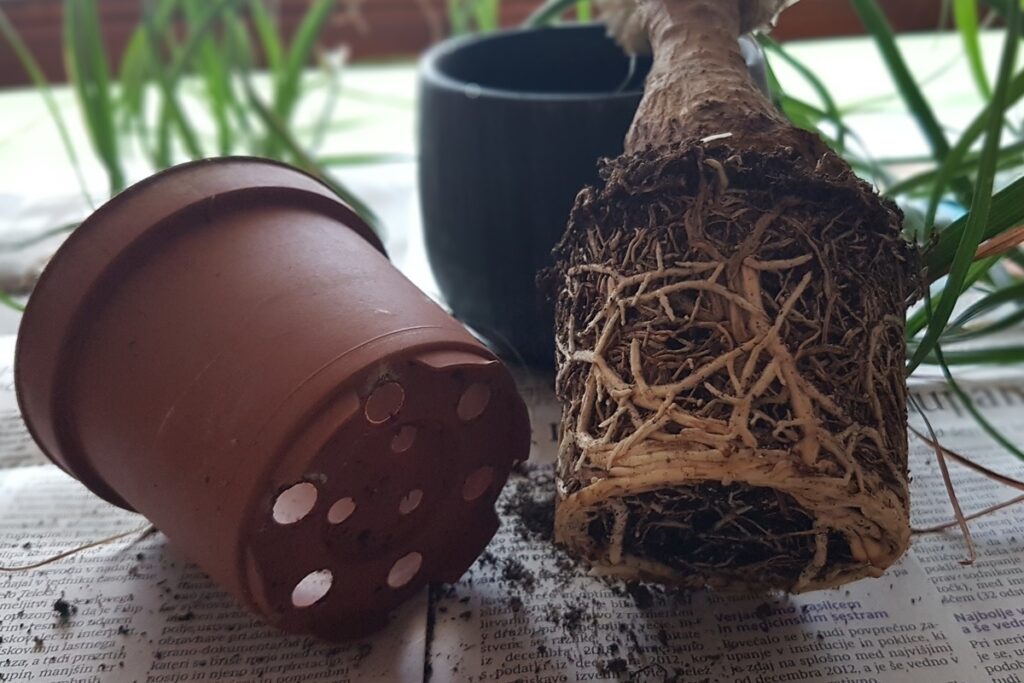 Močno prepletene korenine, ki objamejo celoten prostor starega lonca, so znak, da je čas za nov dom.